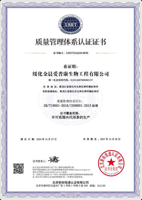 綏化金晨愛普康生物工程有限公司位于黑龍江省中南部地區(qū)的綏化市北林區(qū),所處位置東經(jīng)124度,北緯45度,位于松嫩平原的呼蘭河流域,“有寒地黑土,塞北江南”的美譽,是全國重要的商品糧基地,屬中溫帶大陸性季風氣候,四季分明,雨熱同期,冬季冰雪覆蓋,夏季降雨集中氣候溫熱濕潤。綏化金晨愛普康生物工程有限公司是一家專業(yè)從事健康養(yǎng)生產(chǎn)品研發(fā)、生產(chǎn)及銷售企業(yè),公司占地總面積8000平方米,建筑面積5000平方米,公司周圍無任何污染源,是食品生產(chǎn)基地。公司生產(chǎn)車間潔凈度級別達到10萬級,同時擁有數(shù)十臺先進的生產(chǎn)設備及高科技檢驗儀器,從產(chǎn)品的原輔料、中間品、成品到銷售的全過程嚴格把關(guān),使生產(chǎn)中每道工序都符合產(chǎn)品的高標準要求,從而保證了公司生產(chǎn)的每一袋產(chǎn)品合格,無質(zhì)量缺陷。綏化金晨愛普康生物工程有限公司率先采用了企業(yè)資源ERP管理系統(tǒng),肩負著養(yǎng)生產(chǎn)業(yè)的重要課題,同時又是江蘇省國家藥用植物重點實驗中心科研成果轉(zhuǎn)化的生產(chǎn)試驗基地,公司核心成員均為本科以上學歷。生產(chǎn)的產(chǎn)品有近五十個品種的代用茶產(chǎn)品,公司先后通過HALAL國際認證,編號為SSPY-201318-33849;ISO9001質(zhì)量管理體系認證編號為XBH···